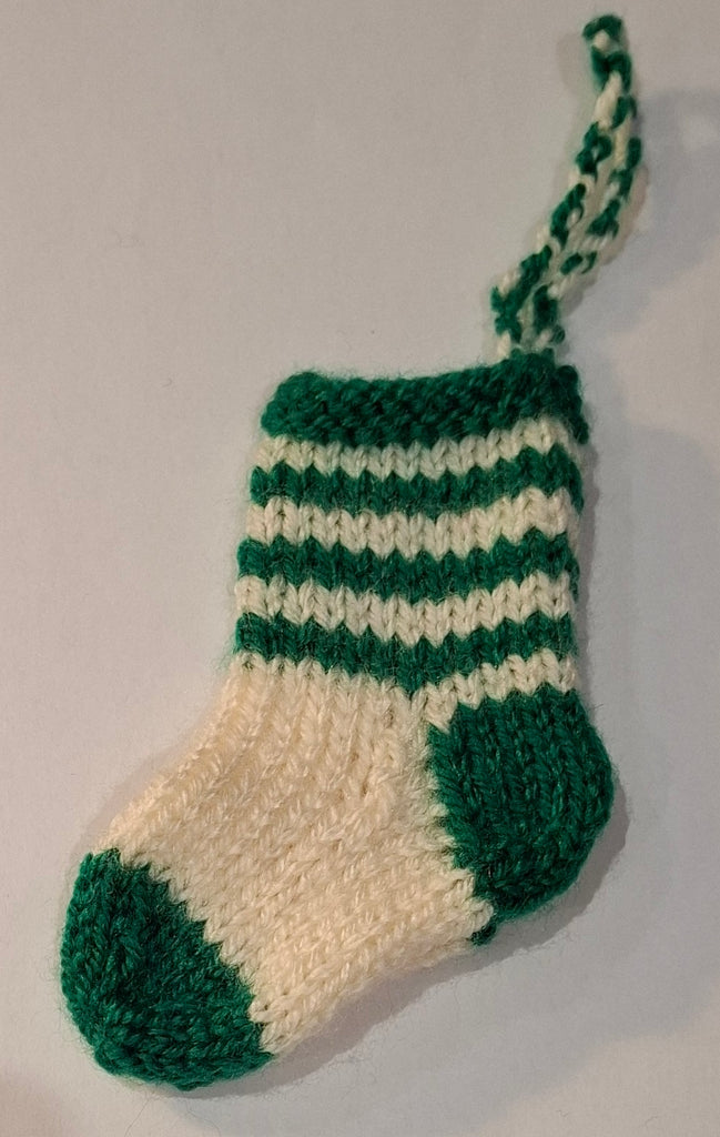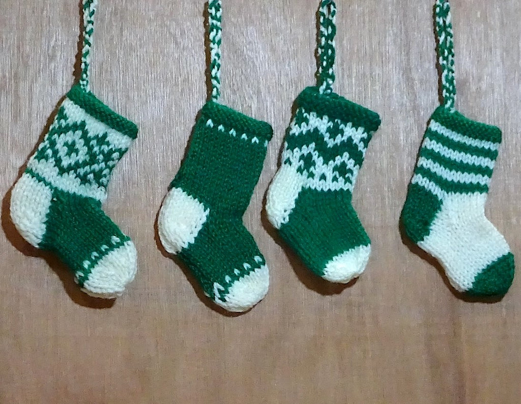 These handknitted green socks are perfect for small gifts to hang on your Christmas Tree.